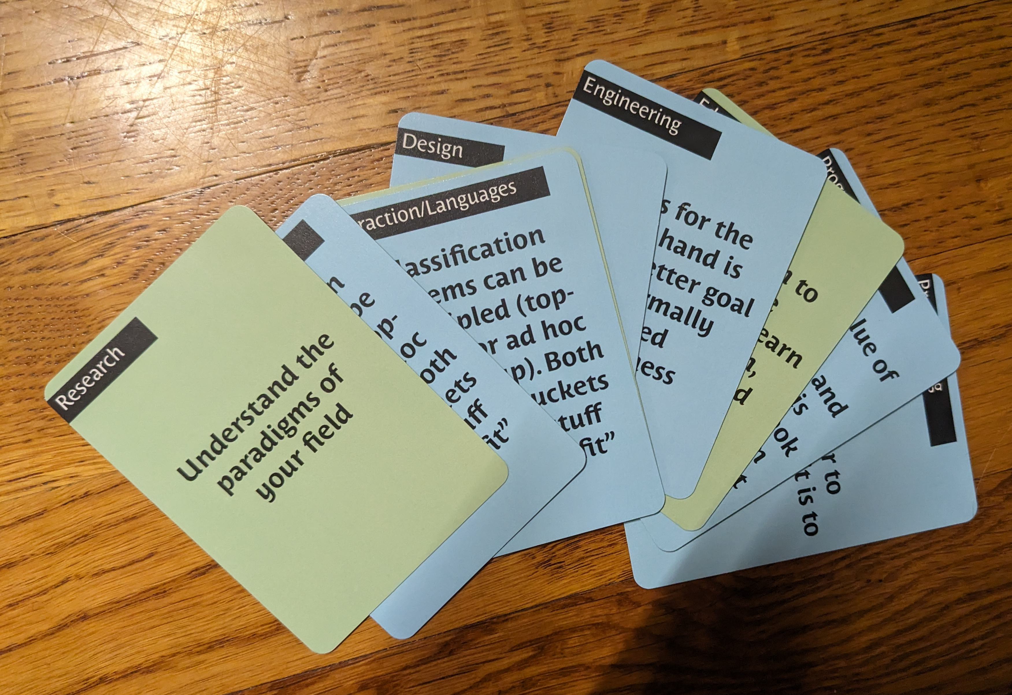 A deck of cards, each with a “Nudge” on the blue/green side, and more explanation on the yellow side.